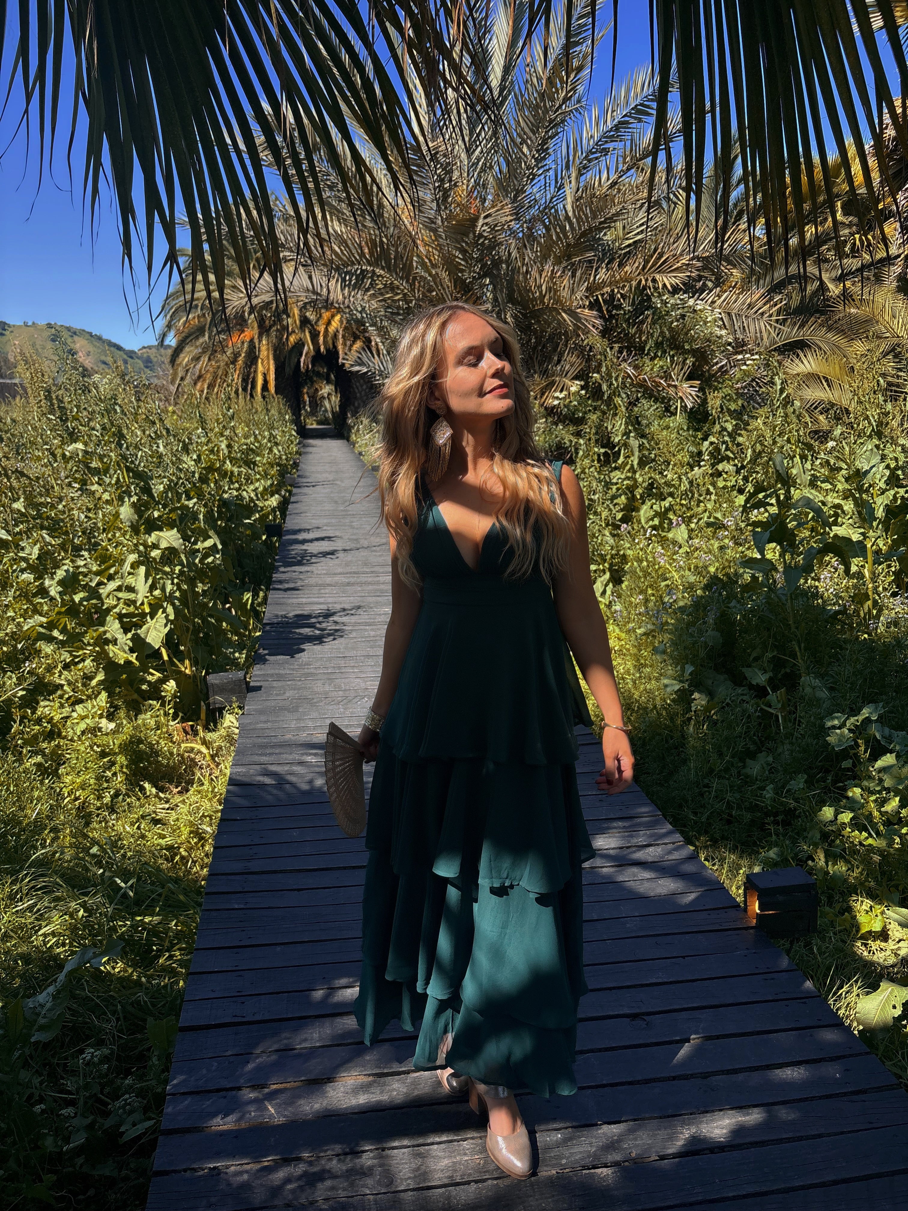 Haz de tu ocasión un momento inolvidable con el Vestido Andrea en verde botella. Confeccionado en un chiffon liviano y fluido, este diseño destaca por su caída elegante y su silueta etérea. Presenta tirantes anchos, escote en V delantero y trasero, y delicados pliegues en el busto y la cintura, que realzan la figura con sutileza. La falda larga con capas escalonadas aporta movimiento y una presencia sofisticada en cada paso.