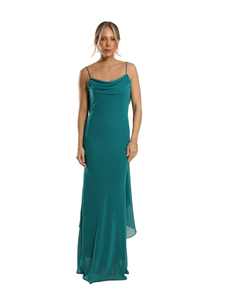 Un best seller absoluto entre nuestras clientas, ya que ofrece una combinación irresistible de comodidad y elegancia. Su diseño minimalista con pliegues delicados en el busto, escote tipo barco y capa fluida en la espalda realza la silueta con discreción y encanto. Un vestido elegante, ideal para invitadas a matrimonios, graduaciones o eventos formales.