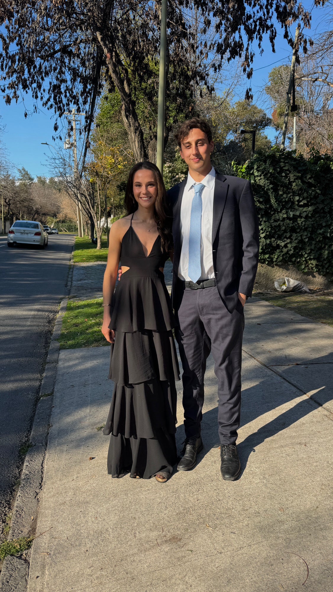 Confeccionado en chifón liviano, este diseño cuenta con un escote en V y un corpiño ajustado, sostenido por delicados tirantes que se cruzan en la espalda sobre un elegante corte en forma de ojal, finalizando con un lazo ajustable. La abertura en la espalda se extiende hacia los costados, destacando una falda maxi con capas fluidas que aportan movimiento y sofisticación. Su cierre de cremallera oculta en la parte trasera asegura un ajuste impecable.
