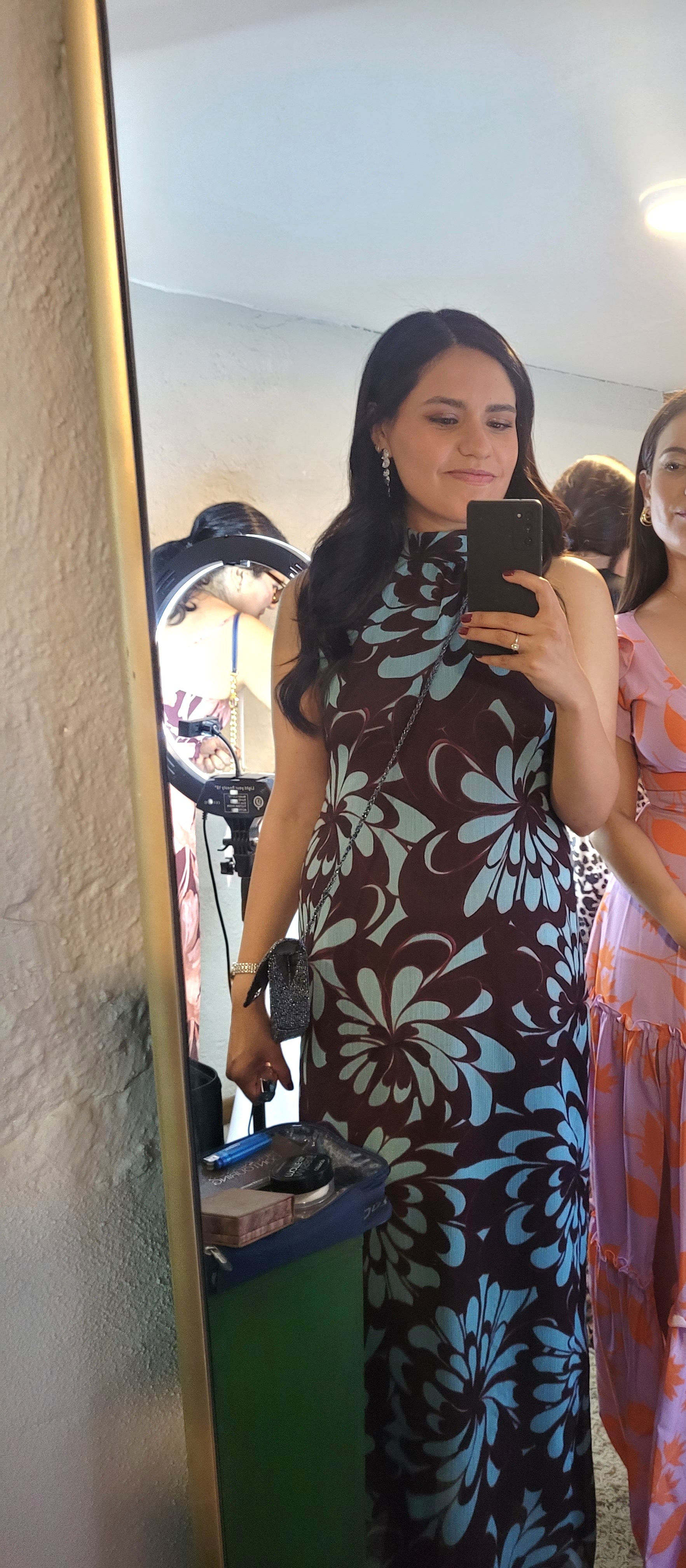 El Vestido Florie destaca por su estampado geométrico vibrante en tonos burdeos y turquesa, sobre una base ligera de gasa bambula. Su diseño de cuello halter con amarra posterior aporta un toque sofisticado y femenino, ideal para quienes buscan una silueta fresca pero elegante.
