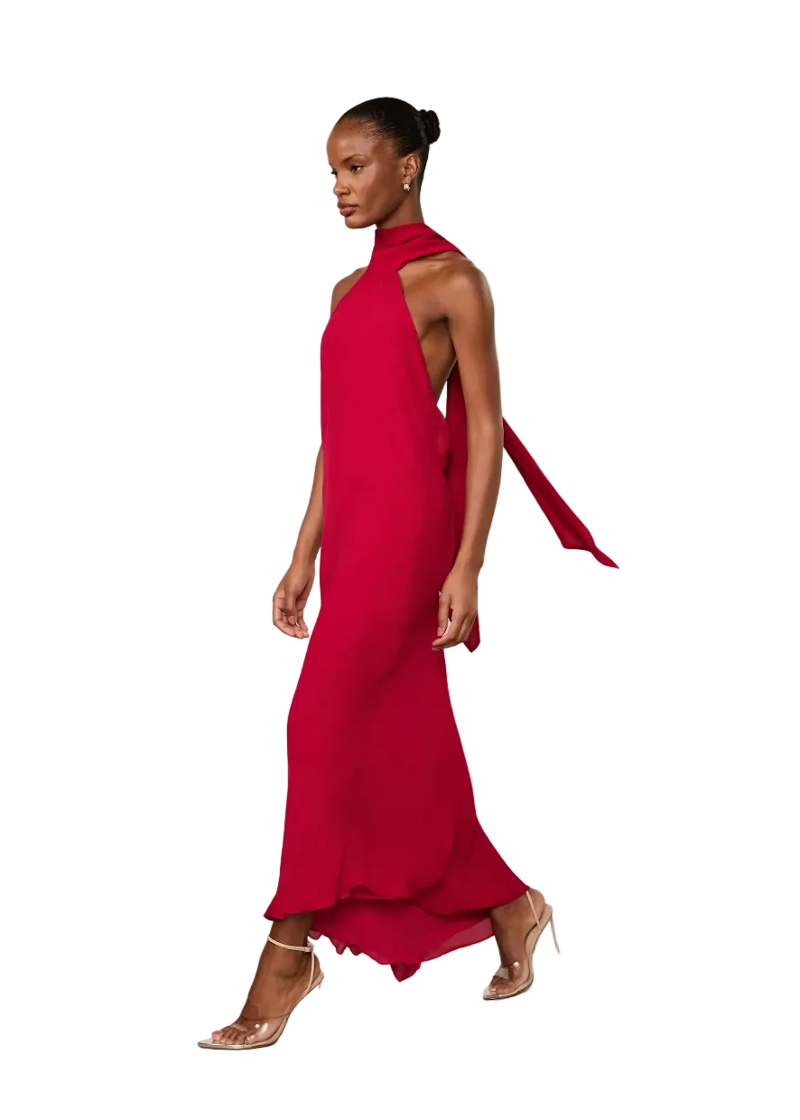 Este vestido largo confeccionado en georgette liviano destaca por su diseño sofisticado y fluido, ideal para eventos especiales. El escote halter asimétrico, con drapeado delicado, aporta un look moderno y elegante, mientras que la espalda descubierta realza la silueta con sensualidad y ligereza.