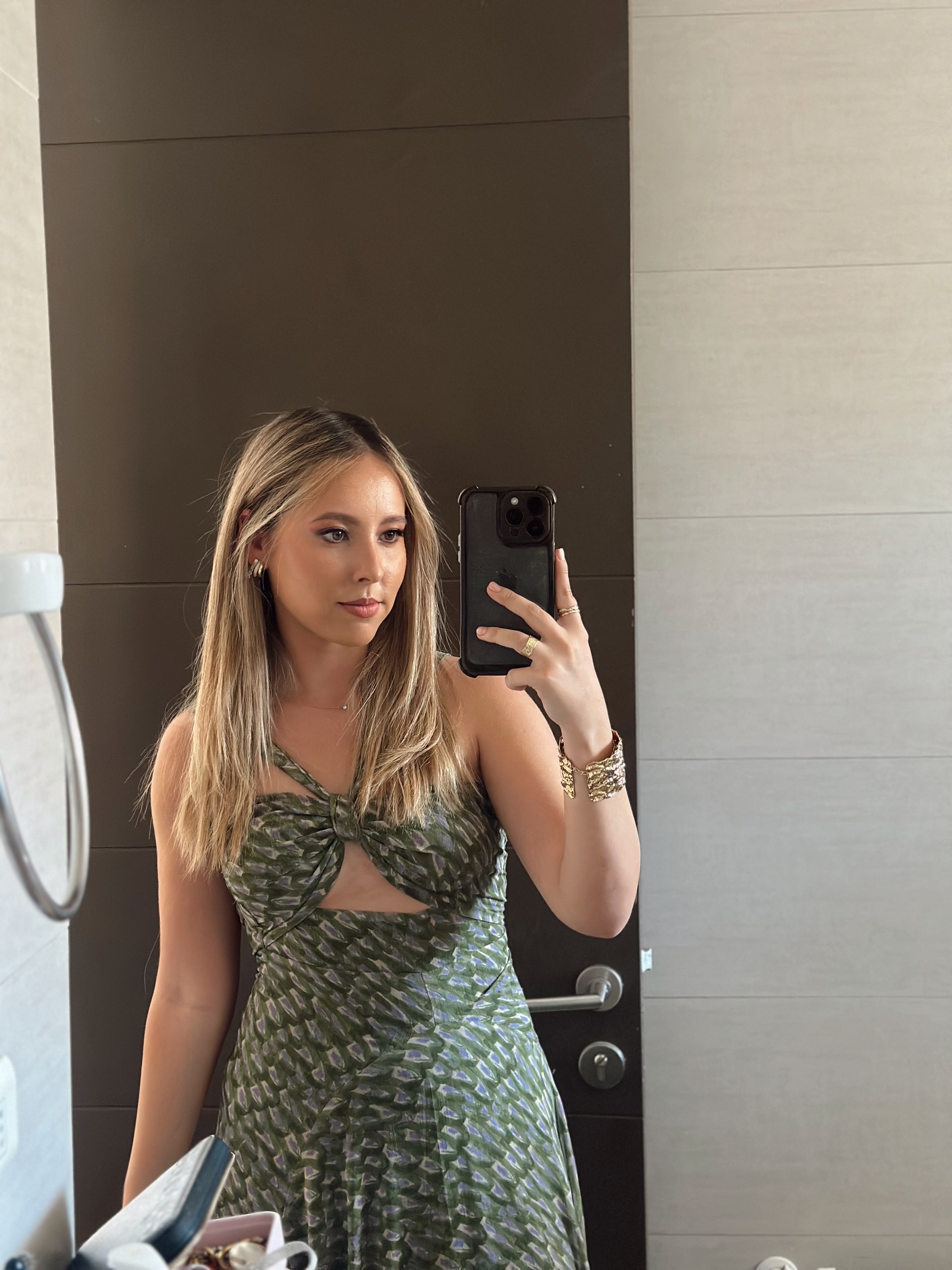 Maxi vestido caído con aberturas y un movimiento de lo más elegante. Escote con tiras al cuello anudadas con doble posibilidad de posición en la parte trasera. Espalda descubierta con la que resaltar tu bronceado este verano y cierre trasero con cremallera. Su tejido con motivos de pinceladas en tonos verdes y lilas lo hacen muy especial. Combínalo con una capa de seda lila o violeta y con tacones para un look más elegante o con zapato plano para un look más casual!