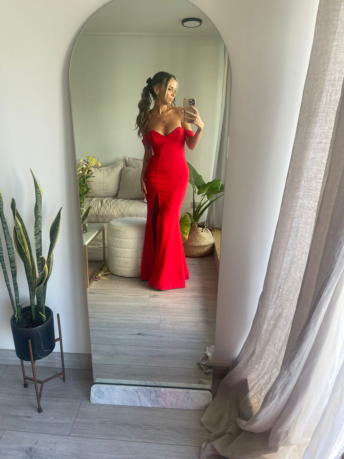 Vestido elegante, con hombros descubiertos y ajuste perfecto.