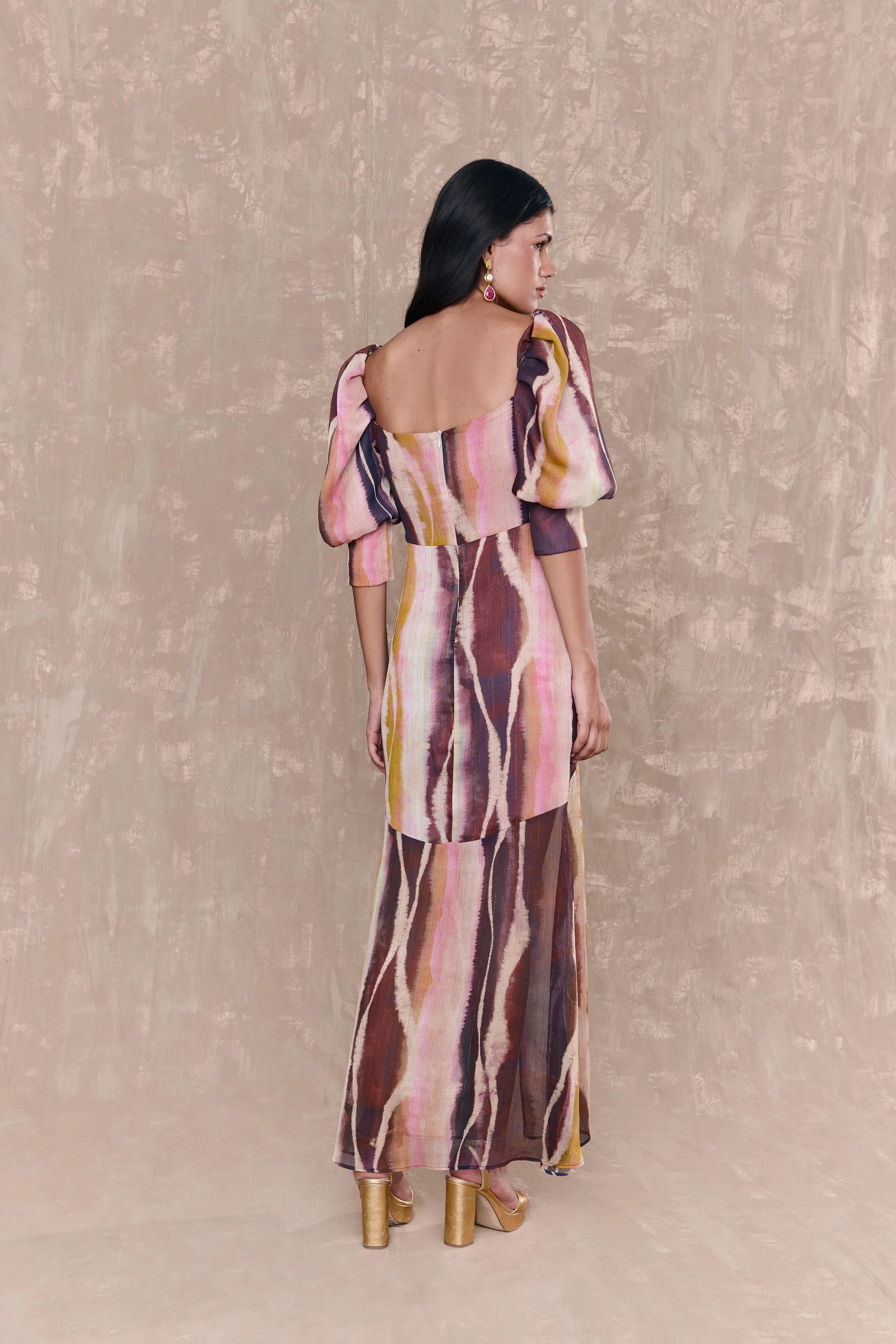 Nuestro vestido Loan Multicolor Print está confeccionado en chifón lurex estampado con tonos de rosa polvora, vino, mostaza, blanco roto y visón.