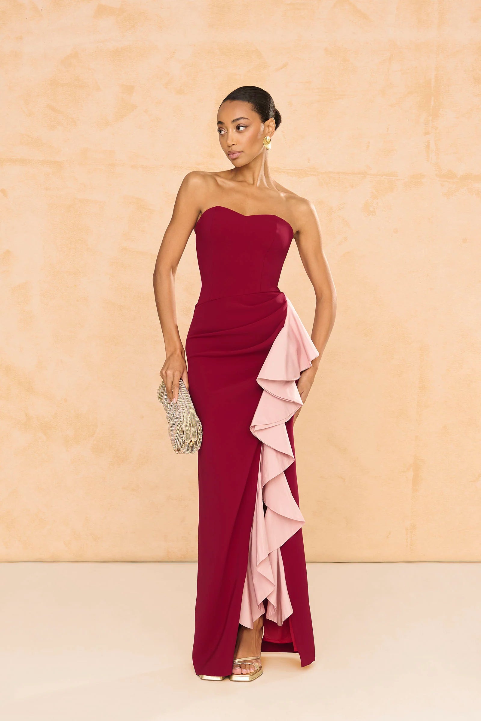 Un vestido largo de ensueño confeccionado en crepé granate que no pasará desapercibido. Su diseño con escote palabra de honor realza la silueta con sutileza, mientras que el elegante volante vertical en el lateral izquierdo aporta movimiento y sofisticación. Completamente forrado y con un tejido que no se arruga, es la opción perfecta para quienes buscan comodidad sin renunciar al estilo.