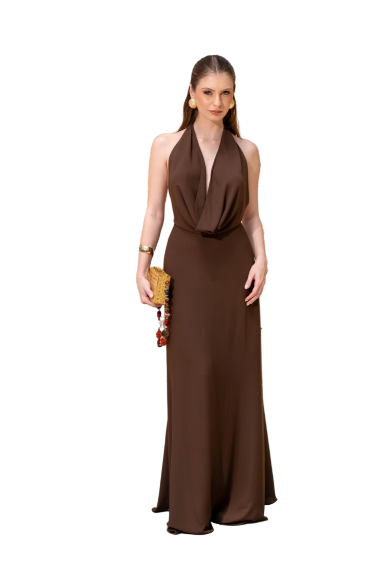 Confeccionado en crepé, ofrece una caída suave que realza la silueta femenina. Su diseño presenta un escote halter que destaca el cuello y los hombros, mientras que el detalle drapeado en el busto añade un toque de sofisticación. La falda larga, con su movimiento fluido y delicado, aporta sensualidad y encanto, convirtiendo este vestido en la elección ideal para ocasiones especiales.