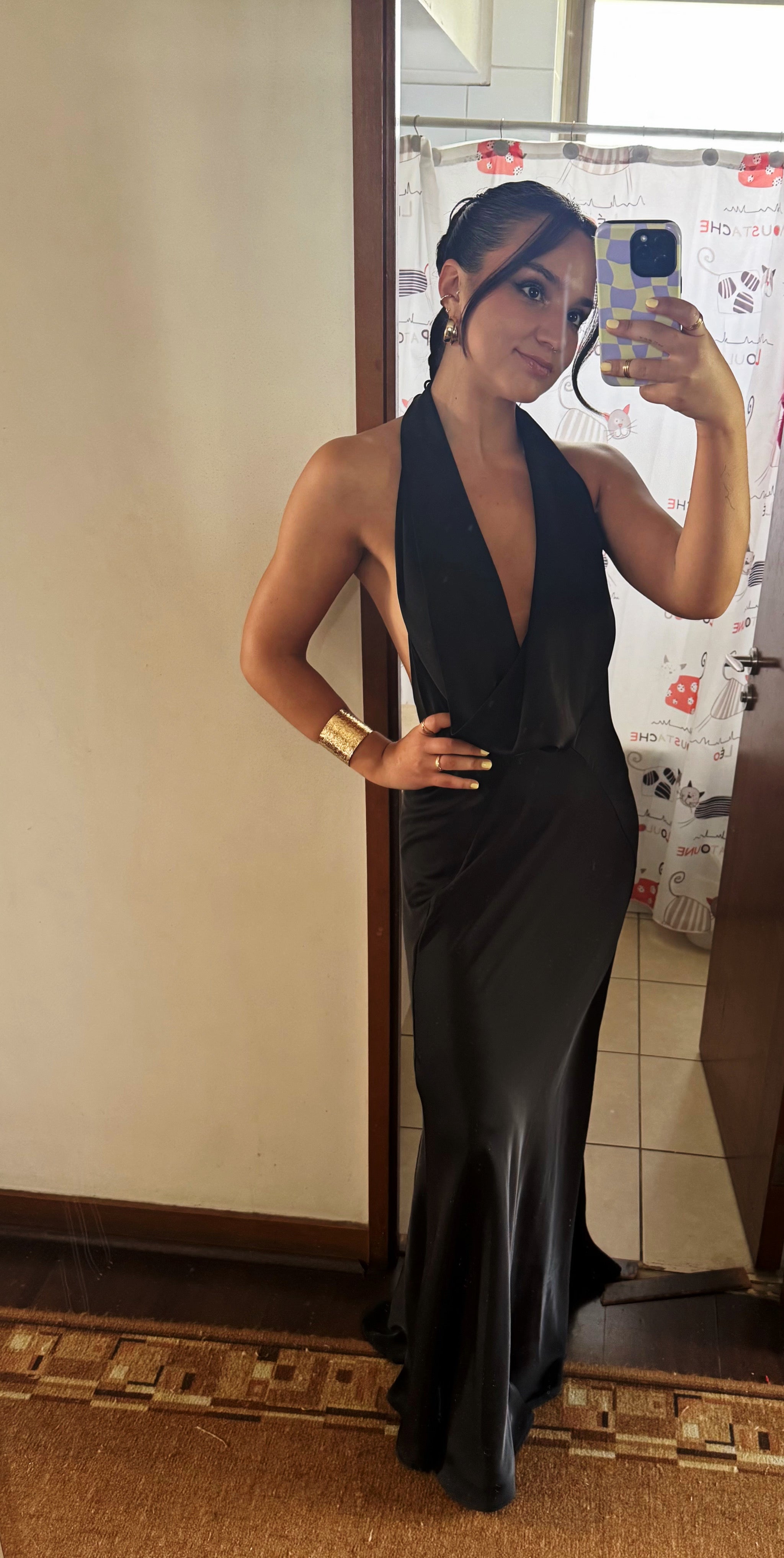 Vestido satinado negro atemporal e irresistiblemente cautivador. Con un profundo escote drapeado, espalda descubierta y tirantes de cuello halter para atar, la silueta sensual ofrece un estilo hipnótico nocturno.