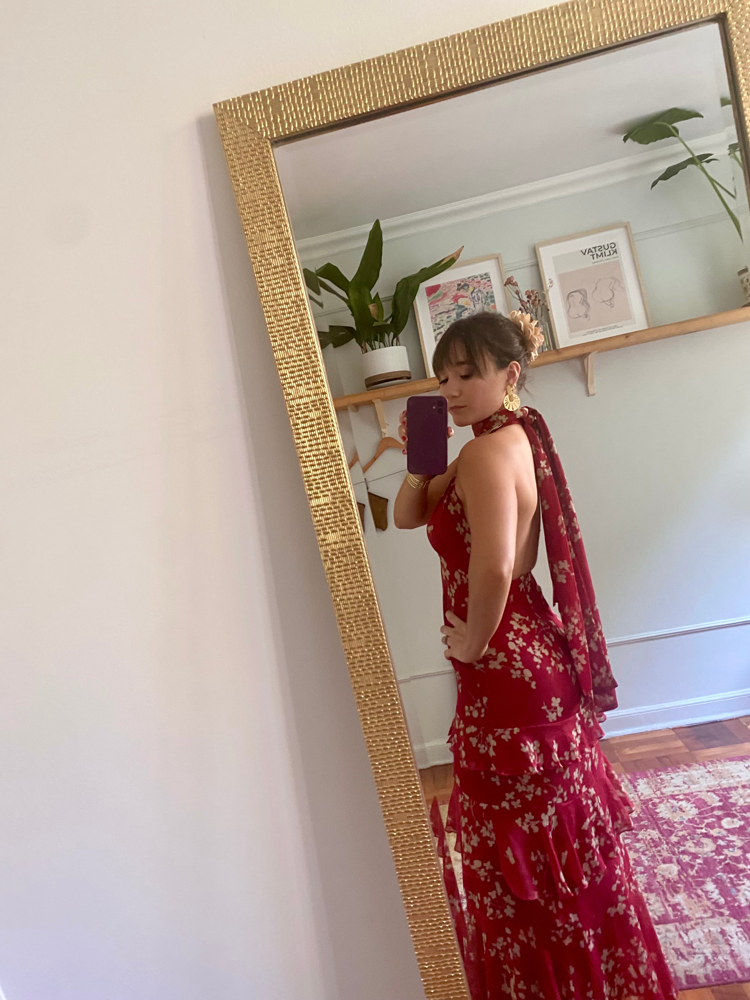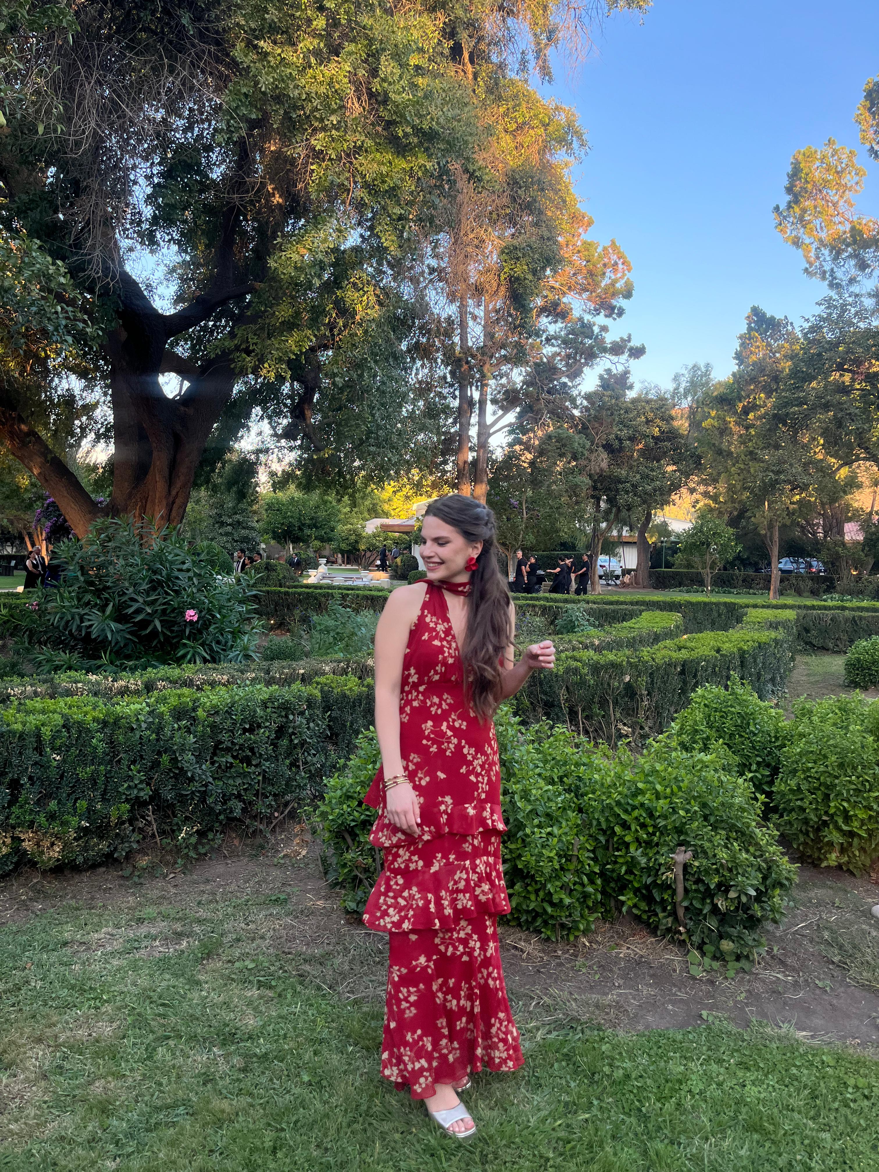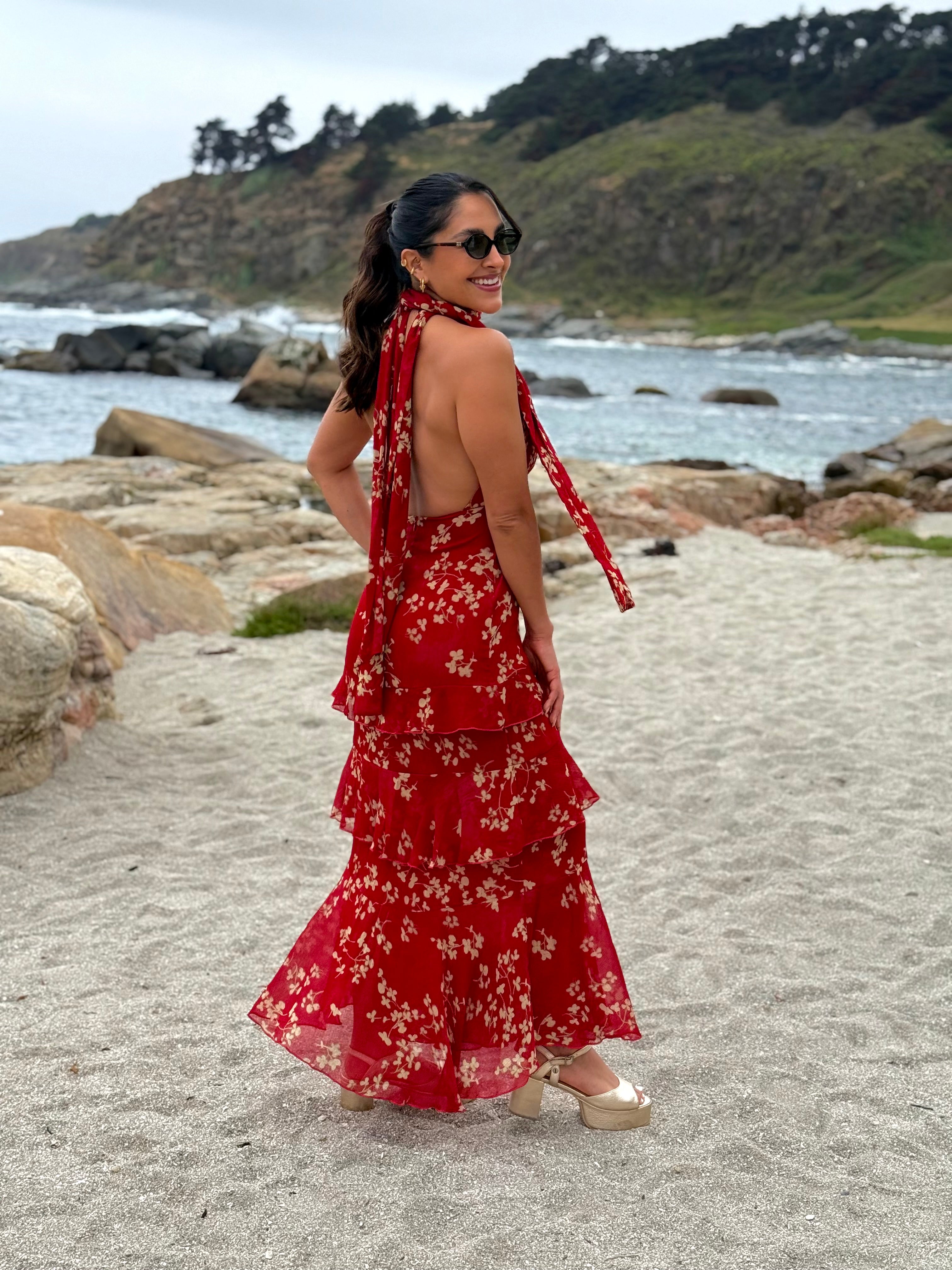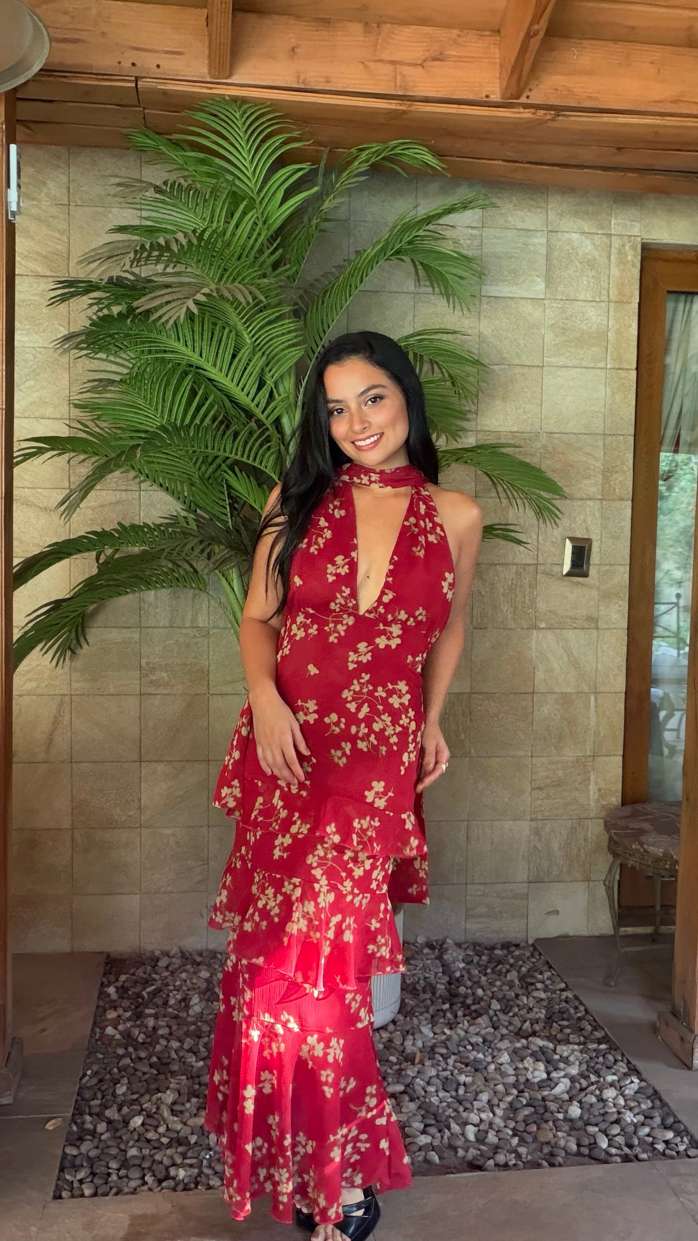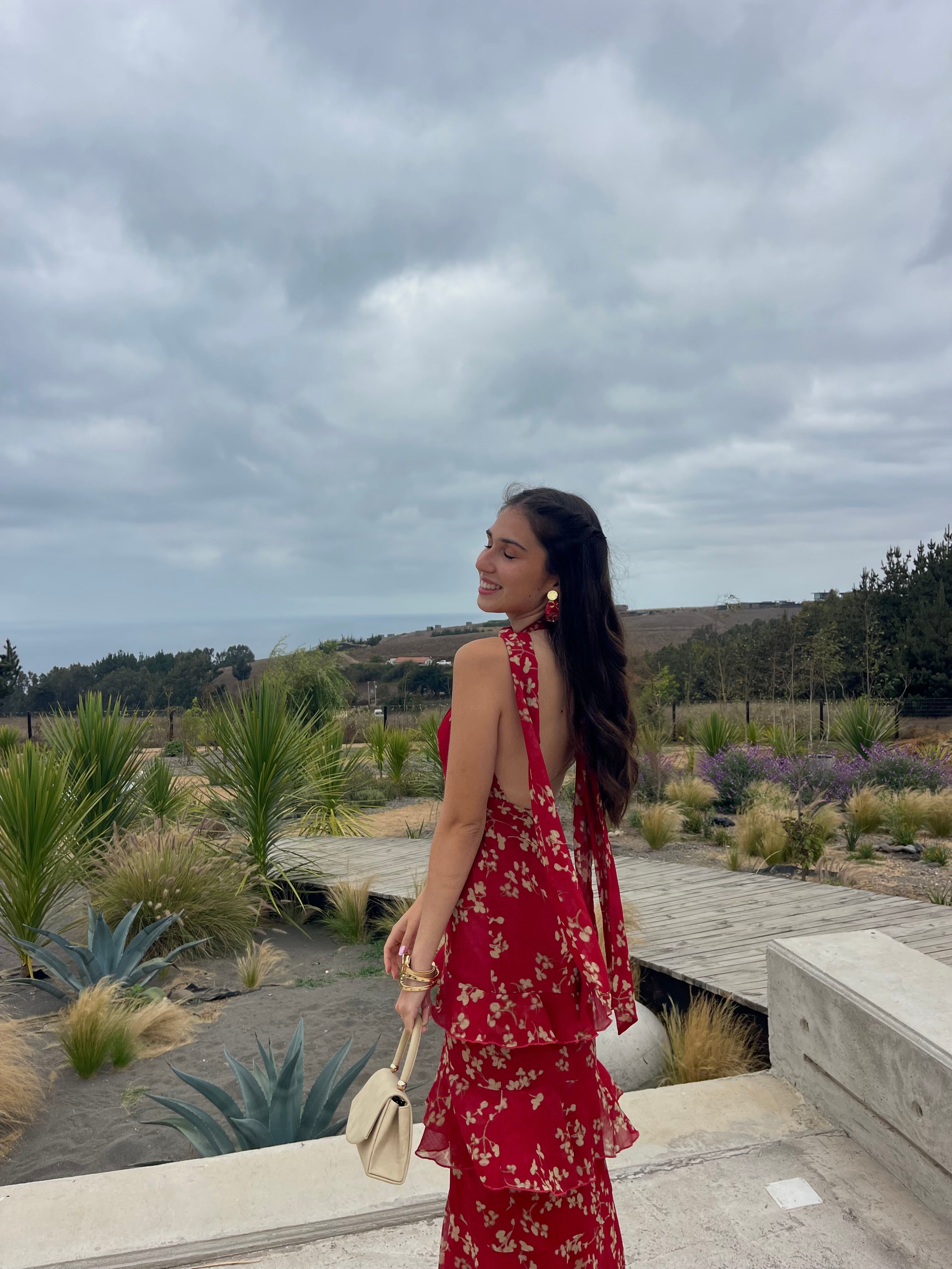 El Vestido Noelie destaca por su intenso tono rojo y los delicados detalles de flores en bruto, que le aportan un aire romántico y elegante. Su diseño juega con capas de volantes que añaden movimiento y fluidez a la silueta. Un profundo escote, ajustable en la espalda, da paso a un sensual escote abierto en la parte posterior. Los volantes en cascada continúan a lo largo de la falda, aportando dinamismo en cada paso.