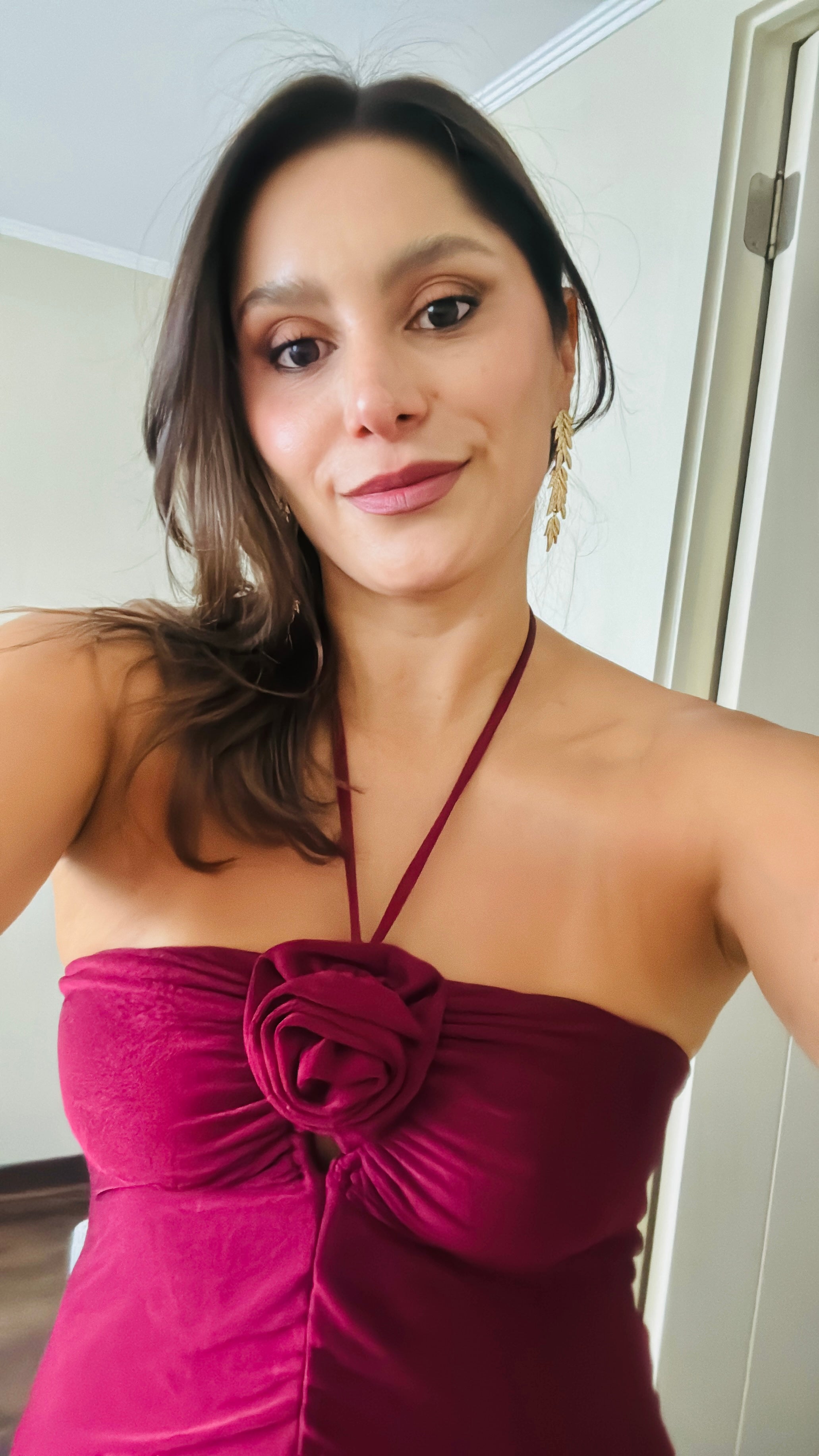 Vestido largo con cuello halter con lazada, detalle de flor en el pecho, cut out y frunces en la parte delantera.