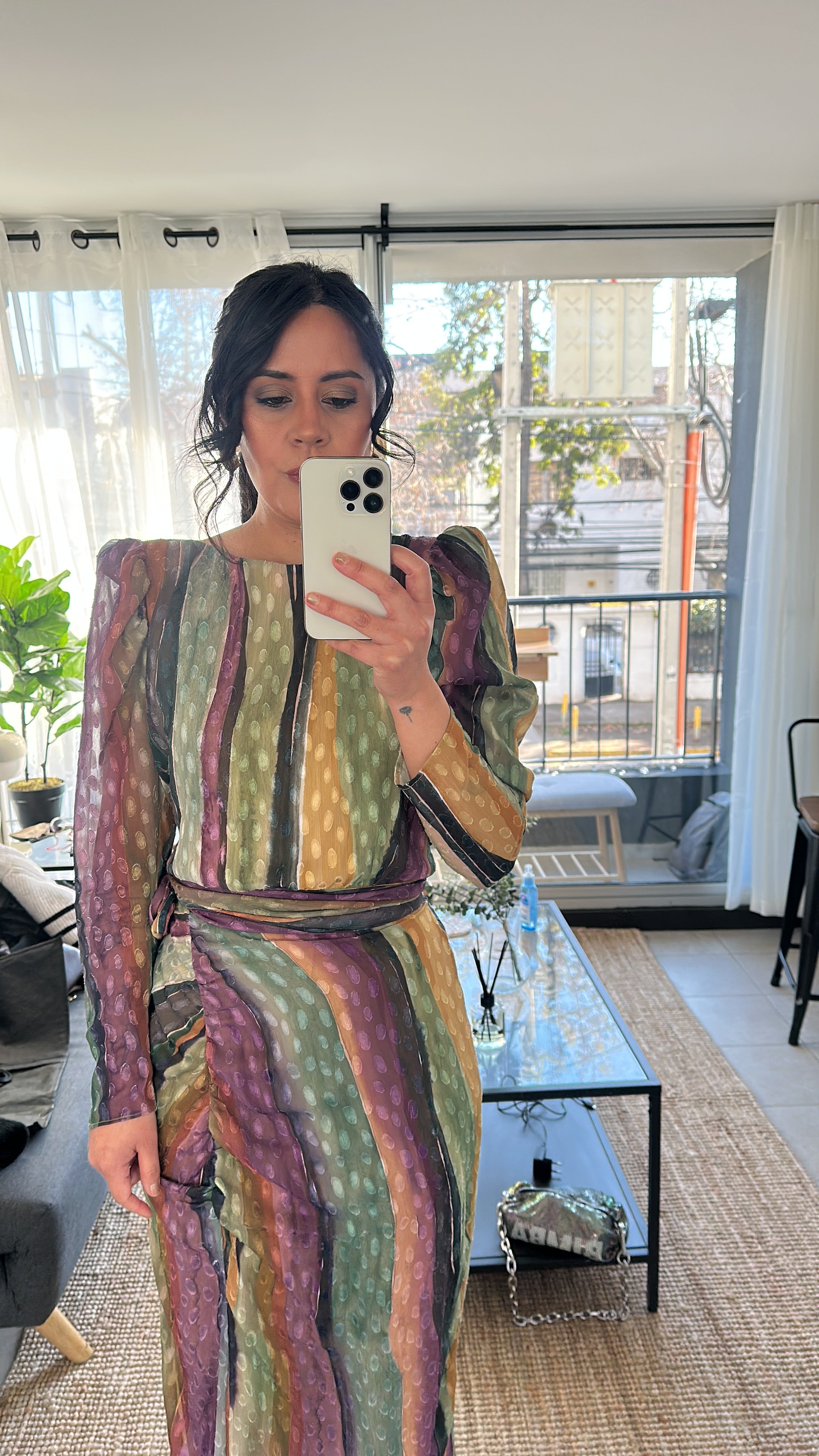 Zoe es pura elegancia, confeccionado en gasa de alta calidad con efecto devoré (lunares con transparencia) Escote cerrado pero con una apertura en espalda y falda de corte midi con un ligero drapeado en falda para estar de lo más cómoda,